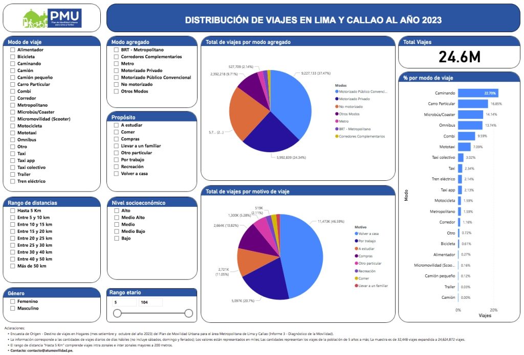 En el año 2023, la Autoridad de Transporte Urbano para Lima y Callao (ATU) recolectó información sobre el desplazamiento de las personas por la ciudad como uno de los insumos para su preparación del Plan de Movilidad Urbana (PMU) para Lima y Callao.