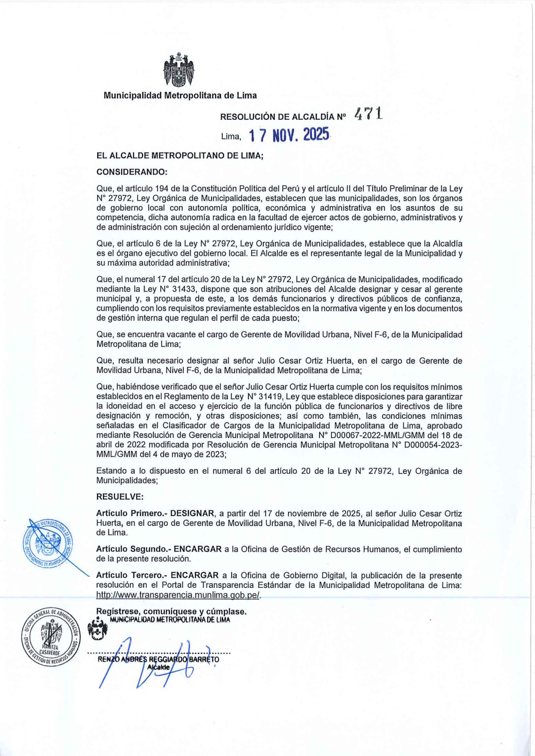 Ese mismo día, a través de la Resolución de Alcaldía Nº 471, el municipio designó al señor Julio Cesar Ortiz Huerta como nuevo Gerente de Movilidad Urbana, cargo de nivel F-6. La designación se sustentó en las facultades establecidas por la Ley Orgánica de Municipalidades y en el cumplimiento de los requisitos técnicos y normativos por parte del nuevo funcionario.